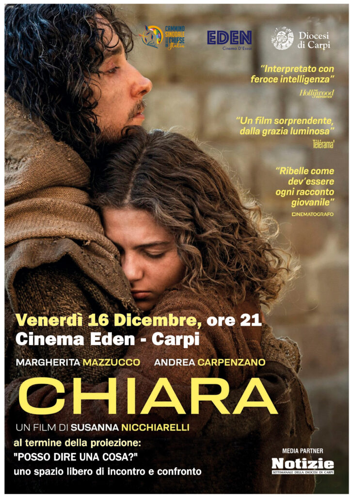 Venerdì 16 dicembre, alle 21, al Cinema Eden, verrà proiettato il film Chiara di Susanna Nicchiarelli. Al termine della proiezione è previsto lo spazio dal titolo Posso dire una cosa? come momento libero di incontro e di confronto fra gli spettatori. L’iniziativa è promossa dalla Diocesi di Carpi insieme al Cinema Eden.