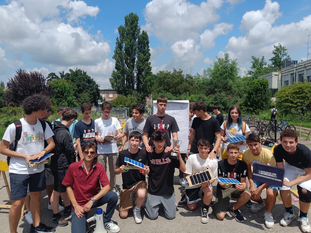 Il 6 giugno all’Istituto tecnico Leonardo Da Vinci di Carpi è andata in scena l’edizione 2023 di Ruote solari: corsa di macchinine alimentate, come si intuisce dal nome, dall’energia del sole ed è rivolta agli studenti delle classi seconde del Corso di Meccatronica. I ragazzi, divisi in gruppi, hanno progettato i veicoli, un mix di falegnameria meccanica ed elettrotecnica, mettendo a frutto le conoscenze acquisite, dalla fisica alla tecnologia. Celle solari e circuiti elettrici costituiscono il cuore che batte di queste macchine a cui i ragazzi conferiscono poi il “vestito” che preferiscono. I veicoli, 16 in totale, si sono poi dati battaglia nella pista allestita nel cortile della scuola. I vincitori, ovvero coloro che hanno costruito il mezzo che ha totalizzato il miglio tempo tra andata e ritorno, sono stati quattro ragazzi di 2CM: Tommaso Guandalini, Filippo Rivalini, Gabriele Dall’Oglio e Alessandro Pavarotti.