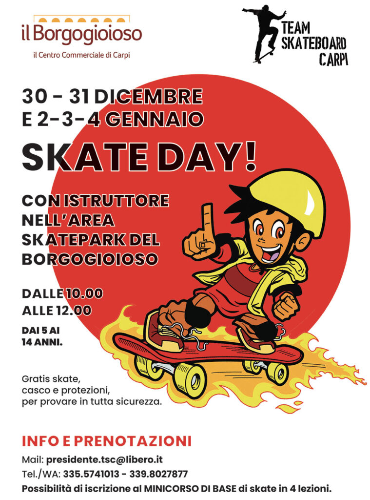 Anche quest’anno i genitori che si recheranno a fare spesa al Centro Commerciale potranno portare a provare a skeitare i propri figli in sicurezza ed, eventualmente, fare un mini corso di skate con istruttori qualificati organizzato nei giorni 30/ 31 dicembre e 2/3/4 gennaio dal Team Carpi Skate presso l’area Skatepark nel Centro Commerciale Il Borgogioso.