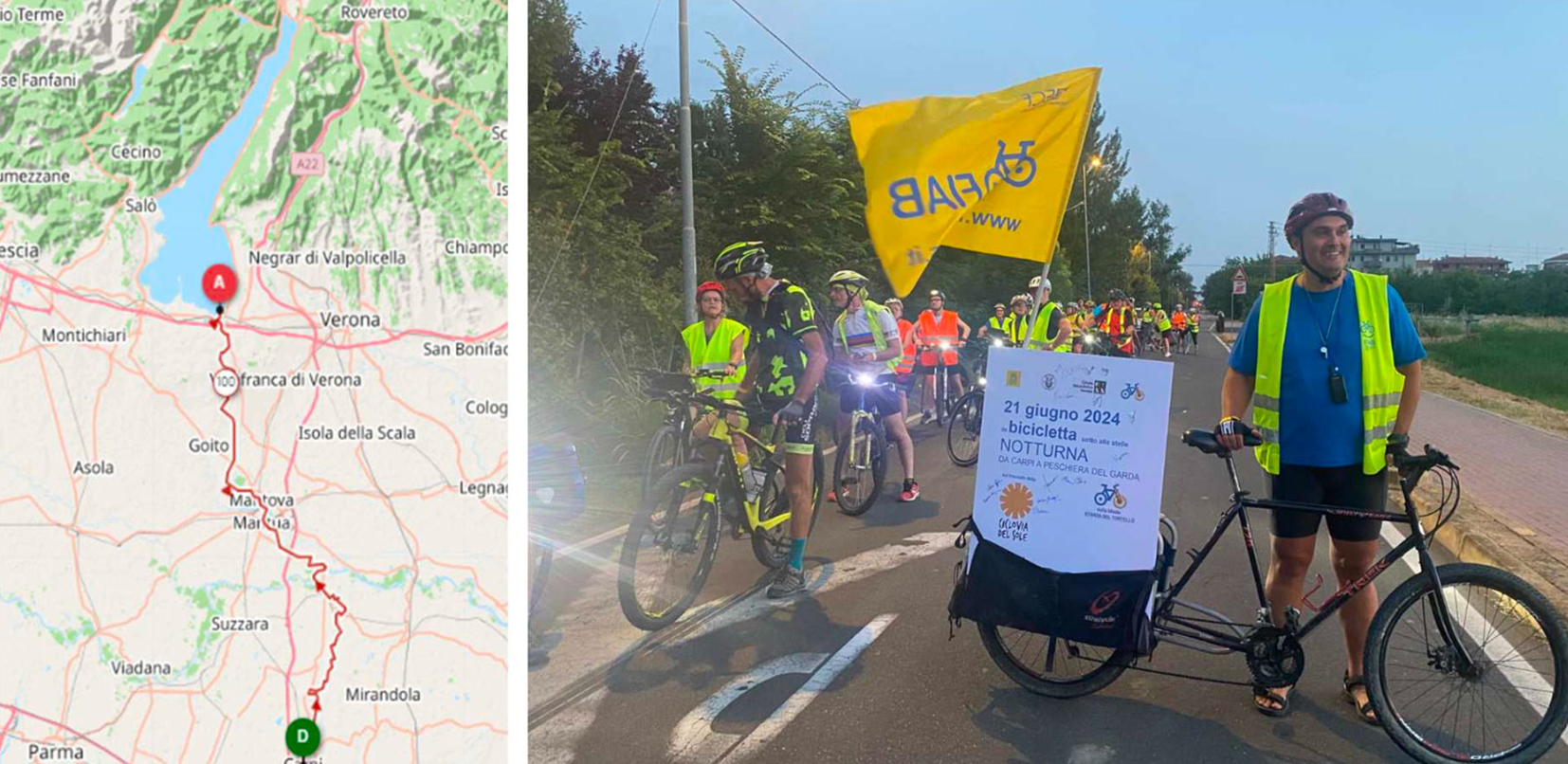 Fiab Modena-Carpi, Pedale Selvaggio e Circolo Naturalistico Novese organizzano venerdì 11 luglio la quinta edizione della Pedalata Notturna da Carpi al Lago di Garda. Da quest’anno l’iniziativa coinvolge l’intero territorio dell’Unione delle Terre d’Argine, con il patrocinio e la partenza in bicicletta dai quattro comuni delle Terre d’Argine: Campogalliano, Soliera, Carpi e Novi. Si pedala come di consueto sul tracciato della Ciclovia del Sole e sulla ideale Strada del Tortello nei territori di tre regioni: Emilia Romagna, Lombardia e Veneto; nelle province di Modena, Mantova e Verona. Si parte da Campogalliano e da Soliera per ritrovarci tutti a Carpi dove si ripartirà alla volta di Novi di Modena, per poi proseguire verso nord e dopo circa 4 km il Biscione si immetterà sulla Ciclovia del Sole fino a Peschiera del Garda, passando per l’Impianto Idrovoro di Mondine, Bondanello, Quistello, San Benedetto Po, Bagnolo San Vito, Mantova, Soave, Marengo, Pozzolo sul Mincio, Borghetto per arrivare a Peschiera del Garda.
