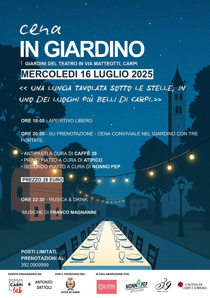La cena in giardino. E’ questo il nome della serata, dal sapore speciale, che si terrà il 16 luglio, a partire dalle ore 20, nel parco dietro al Teatro Comunale di Carpi. Un’iniziativa nuova, voluta dai commercianti aderenti a Carpi Lab, e inserita nella programmazione de I Mercoledì d’estate. Grazie alla collaborazione con Antonio Dattoli e tre importanti realtà del territorio, ovvero Caffè 39, Nonno Pep e Atipico, chi vorrà potrà gustare tre portate: antipasto, primo e secondo distribuiti negli stand appositamente allestiti nei giardini pubblici da consumare poi comodamente seduti nella suggestiva cornice verde. Per l’occasione sarà infatti apparecchiata una lunga tavolata che consentirà ai commensali di conversare e condividere un piacevole momento di aggregazione all’aria aperta, con un piacevole sottofondo musicale.