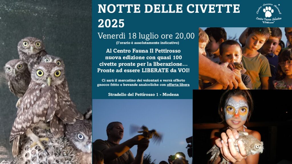 E’ tutto pronto per la Notte delle Civette, un appuntamento attesissimo dai bambini e da tutti gli amanti della natura. La festa, come da tradizione, è al Centro Pettirosso di Modena dove, venerdì 18 luglio, a partire indicativamente dalle 20, un centinaio di civette scomparirà nella notte volando dalle mani dei bambini e non solo. Ancora una volta Il Pettirosso si conferma il centro con la percentuale più alta di liberazione di animali recuperati feriti o in difficoltà: punto di riferimento per il territorio nazionale anche per la formazione sul recupero per istituzioni e forze dell’ordine dove sempre più aumenta la sensibilità sull’argomento.