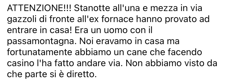 “Attenzione! Stanotte all’una e mezza in via Gazzoli di fronte all’ex Fornace hanno provato ad entrare in casa. Era un uomo con il passamontagna. Noi eravamo in casa ma fortunatamente abbiamo un cane che facendo casino l’ha fatto andare via. Non abbiamo visto da che parte si è diretto”.