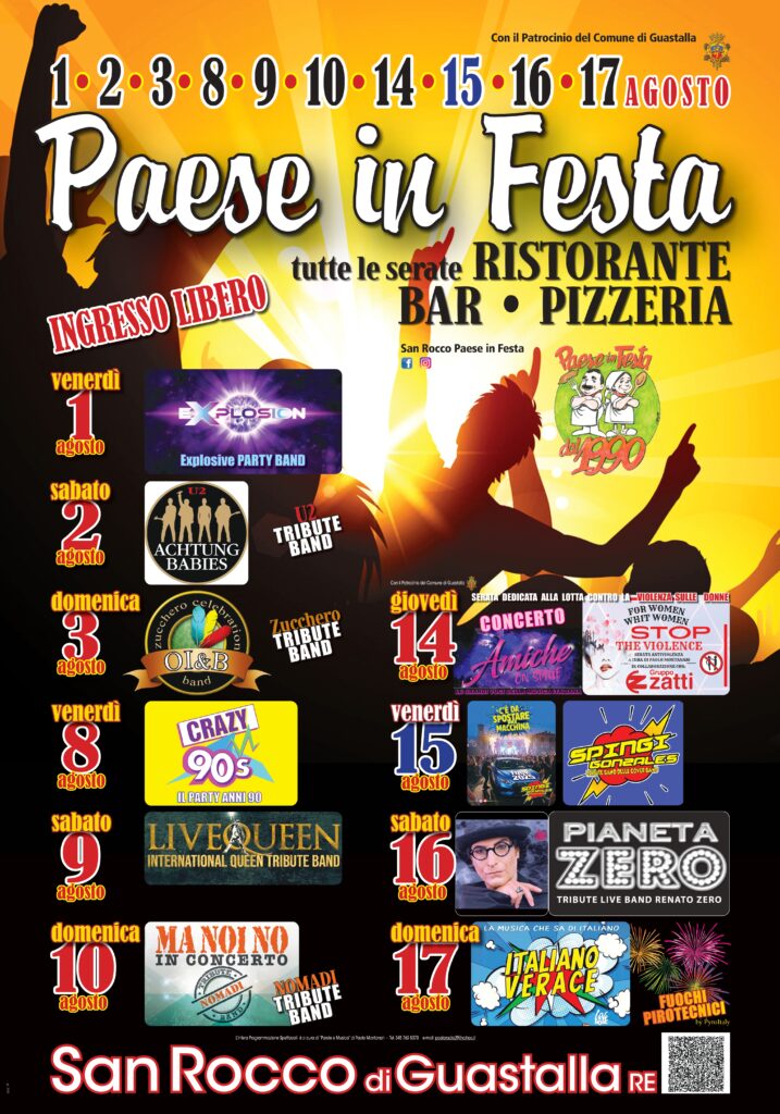 La frazione di San Rocco di Guastalla si prepara a vivere un agosto all’insegna della musica, della convivialità e della solidarietà con la tradizionale kermesse agostana “Paese in Festa”. La manifestazione, che si svolgerà dal 1 al 17 agosto, promette serate all’insegna del divertimento e della cultura, con un programma ricco di concerti, spettacoli e iniziative di sensibilizzazione. L’evento prenderà il via domani, venerdì 1 agosto, con l’energia esplosiva della Explosion – Explosive Party Band, e proseguirà con una serie di appuntamenti imperdibili: sabato 2 agosto sarà dedicato agli amanti del rock con gli Achtung Babies, tribute band degli U2, mentre domenica 3 agosto sarà il momento di Zucchero con gli OI&B. Tutte le serate avranno apertura stand gastronomici alle ore 20, offrendo ai partecipanti la possibilità di gustare specialità locali e piatti tipici, in un’atmosfera di festa e convivialità. ‘Paese in festa’ si conclude in grande stile il 17 agosto con spettacoli pirotecnici