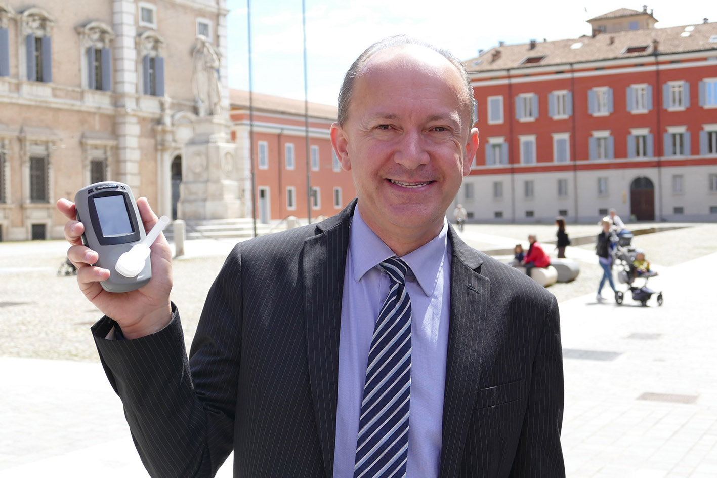 Il dottor Massimo Bigarelli, responsabile del Programma Antifumo dell’Azienda USL di Modena, con il carbossimetro, utilizzato all’inizio e alla fine del corso per mostrare la riduzione della presenza di monossido di carbonio nelle persone che decidono di smettere di fumare