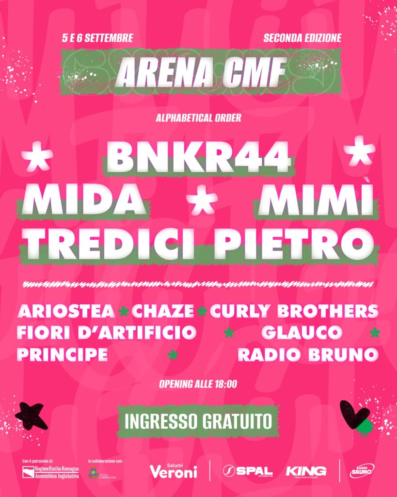 Due serate di musica e divertimento, per la seconda edizione del Correggio Music Festival, evento a ingresso gratuito in programma il 5 e 6 settembre all’Arena Concerti in via Fazzano a Correggio. Si comincia venerdì 5 settembre per il Radio Bruno Hit Party! I DJ e gli speaker regaleranno una serata di musica e divertimento, tutta da ballare e cantare a squarciagola! Per quanto riguarda i live, venerdì 5 sul palco del CMF saliranno i big Mimì Caruso e BNKR44, anticipati da Principe e da Ariostea, la prima dei due vincitori del contest del CMF che porta gli artisti più votati dalla giuria sul palco principale. Grandi nomi anche sabato 6 settembre. A partire da Mida. Nome attesissimo anche quello di Tredici Pietro. In cartellone anche Fiori d’artificio, Glauco e Simone Tosco, in arte Chaze, In chiusura, direttamente dal cuore del Salento arrivano Urge e Ozzie, i Curly Brothers. Ingresso gratuito per due serate di grande musica e divertimento!