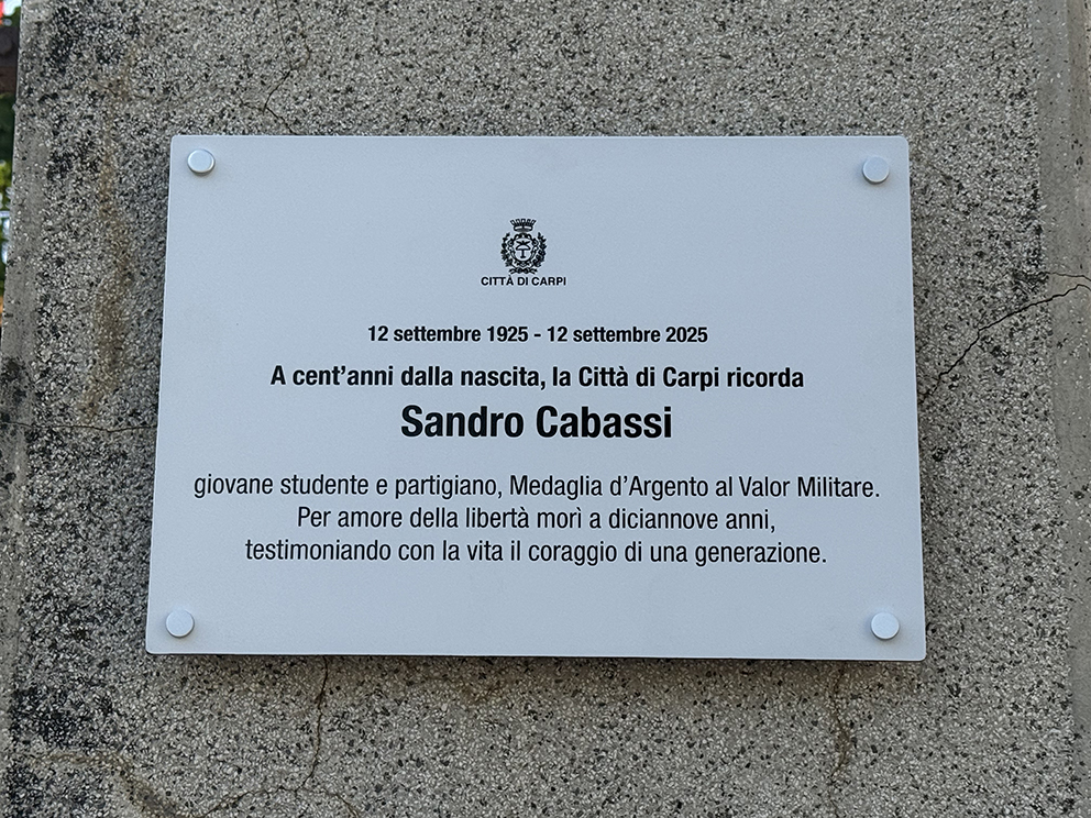 “A cento anni dalla nascita, la città di Carpi ricorda Sandro Cabassi giovane studente e partigiano, Medaglia d’argento al Valor militare. Per amore della libertà morì a diciannove anni, testimoniando con la vita il coraggio di una generazione”. È questo il testo della targa in onore di Sandro Cabassi, partigiano, fucilato dai fascisti a 19 anni nel 1944, posta all’ingresso principale dello stadio che porta il suo nome e scoperta questa mattina, venerdì 12 settembre, nel giorno di quello che sarebbe stato il suo centesimo compleanno. Alla cerimonia sono intervenuti il sindaco di Carpi Riccardo Righi e l’assessora allo Sport Mariella Lugli.