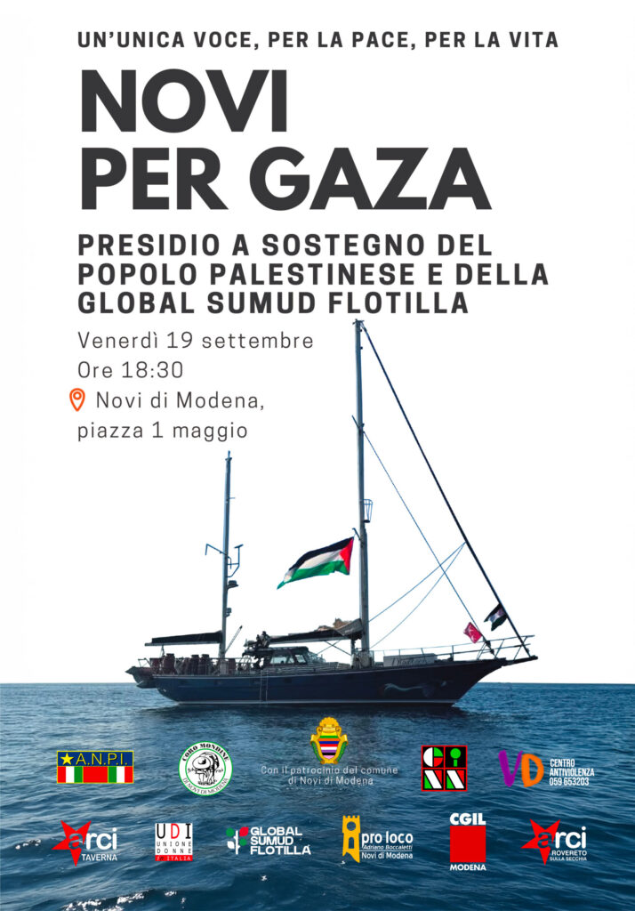 Le sezioni Anpi di Novi di Modena e Rovereto sulla Secchia promuovono venerdì 19 settembre, alle ore 18:30, in Piazza Primo Maggio a Novi un presidio di solidarietà con il popolo palestinese, per chiedere il cessate il fuoco e la fine del genocidio per il sostegno alla missione internazionale Global Sumud Flottilla. L’iniziativa, che ha ricevuto il patrocinio del Comune di Novi di Modena, vede la partecipazione di numerose realtà associative del territorio: Pro Loco Adriano Boccaletti, UDI – Unione Donne Italiane, Circolo ARCI Taverna, Circolo ARCI Anziani di Rovereto, CGIL, Circolo Naturalistico Novese, Coro delle Mondine di Novi e Centro Antiviolenza Vivere Donna. “Come ANPI non possiamo restare in silenzio davanti a ciò che accade a Gaza. La nostra storia e i nostri valori ci chiedono di alzare la voce contro ogni forma di oppressione e di violenza, per difendere il diritto alla vita e alla libertà dei popoli” – dichiara Alessandra Caffagni, presidente ANPI Rovereto sulla Secchia. “Il presidio del 19 settembre è un appello alla coscienza civile della nostra comunità. La pace non è mai un fatto lontano: riguarda tutti noi, qui e ora, e richiede la responsabilità di ciascuno”, aggiunge Cristina Bertolini, presidente ANPI Novi di Modena.