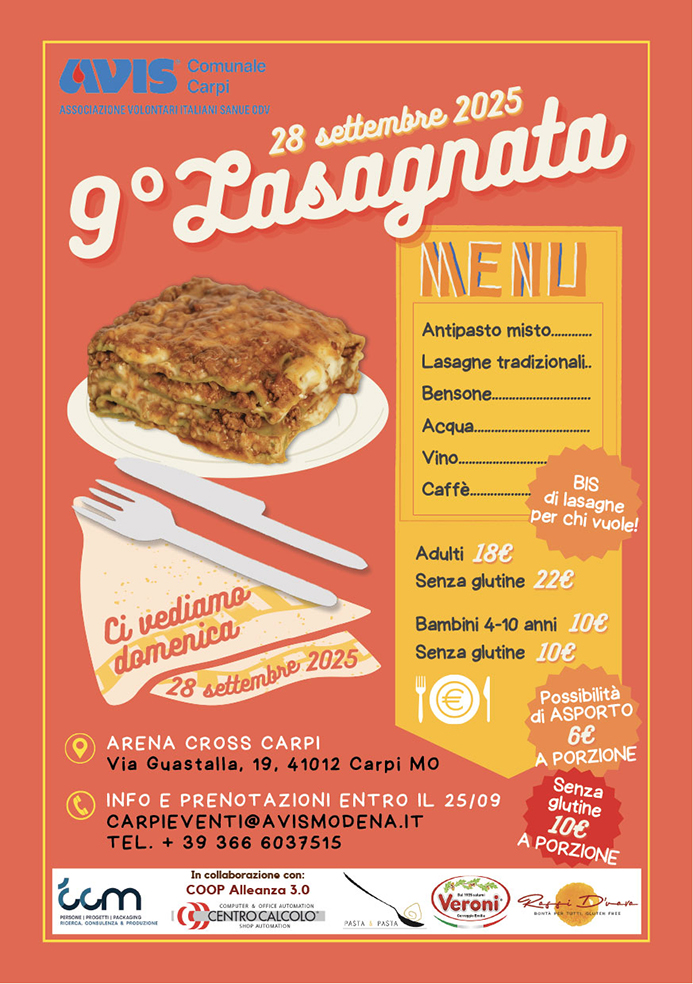 Il pranzo, aperto a tutti, è da leccarsi i baffi: antipasto, bis di lasagne e bensone (18 euro gli adulti e 22 la versione gluten free per celiaci – 10 euro i bambini fino ai 10 anni). E chi non riesce a fermarsi a pranzo non si abbatta, può sempre prenotare una o più porzioni di lasagne al prezzo di 6 euro ciascuna, 10 per quelle senza glutine (per prenotazioni e informazioni: 3666037515 – carpieventi@avismodena.it).