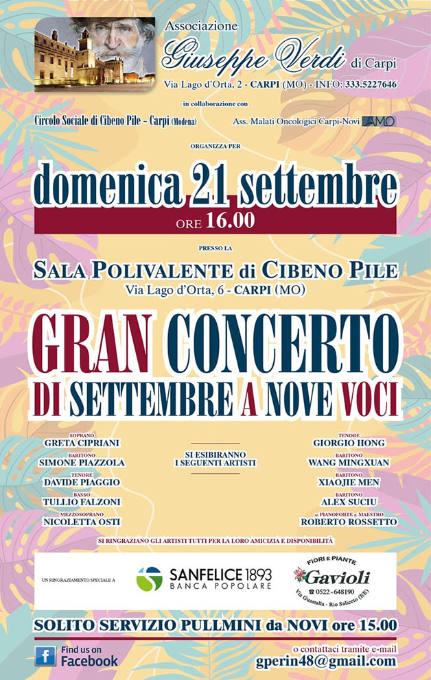L’Associazione Giuseppe Verdi di Carpi organizza, domenica 21 settembre, alle 16, presso la Sala Polivalente del Circolo Sociale Cibeno Pile, Gran concerto di settembre a nove voci. L’evento vedrà la presenza di nove cantanti lirici: il soprano Greta Cipriani, il tenore Davide Piaggio, il basso Tullio Falzoni ed il baritono Simone Piazzola che porterà sul palco dei giovani allievi quali il mezzosoprano Nicoletta Osti, il tenore Giorgio Hong, i baritoni Wang Mingxuan, Xiaoje Men e Alex Suciu, tutti abilmente accompagnati al pianoforte dal Maestro Roberto Rossetto. “Questo concerto vuol essere una mano tesa verso il futuro della lirica grazie alla presenza di queste cinque giovani leve – afferma Gianni Perin, presidente del Circolo Giuseppe Verdi – che potranno così, sia vivere e sperimentare il contatto con il pubblico presente per affinare le loro capacità canore, sia vivere le emozioni di cantare con grandi artisti professionisti. Per questi motivi sarà un pomeriggio in cui si vivranno intense emozioni”.