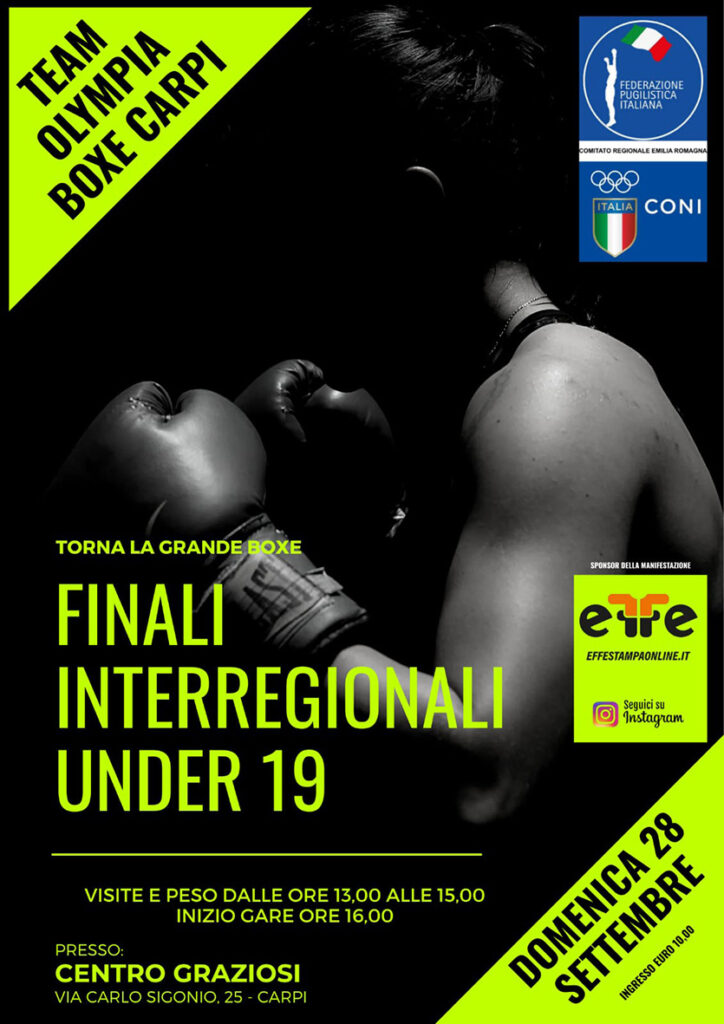 Domenica  28 settembre, a partire dalle 16, il Team Olympia Boxe Carpi organizza nella consueta cornice del Circolo Graziosi di via Sigonio, 25 la manifestazione pugilistica La grande boxe – Finali interregionali Under 19.