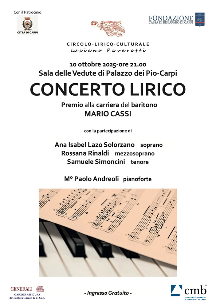 Il 10 ottobre, alle ore 21, nella prestigiosa cornice della Sala delle Vedute di Palazzo Pio, il Circolo lirico culturale Luciano Pavarotti organizza il Concerto Lirico – Premio alla carriera del baritono Mario Cassi. “Dopo alcuni anni di stop – spiega il presidente del circolo, Paolo Dall’Olio – abbiamo deciso di riprendere una delle tradizioni del nostro circolo, ovvero la premiazione, una volta all’anno, di un cantante in carriera di fama internazionale. Per l’edizione 2025 la nostra scelta è ricaduta su Mario Cassi”. A esibirsi insieme a lui vi saranno anche il soprano Ana Isabel Lazo Solorzano, il mezzosoprano Rossana Rinaldi e il tenore Samuele Simoncini, accompagnati al pianoforte dal Maestro Paolo Andreoli. “Il programma – conclude Paolo Dall’Olio – sarà emozionante, con arie e duetti tratti dal repertorio più famoso”.