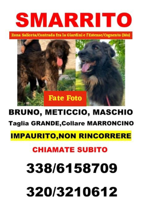 Bruno è un cane meticcio di taglia grande, nero e a pelo lungo. Bruno è buono ma molto impaurito e non si fa avvicinare.  In caso di avvistamento non rincorretelo, se riuscite fate una foto e contattate i suoi proprietari fornendo la posizione di avvistamento e la direzione. Gli ultimi avvistamenti sono stati in zona Saliceta San Giuliano/Contrada fra la Giardini e l’Estense e Cognento, purtroppo si sposta velocemente e potrebbe essersi diretto in qualsiasi direzione. Ogni segnalazione è preziosa, grazie di cuore a chi vorrà aiutare la sua famiglia a riporlo a casa!