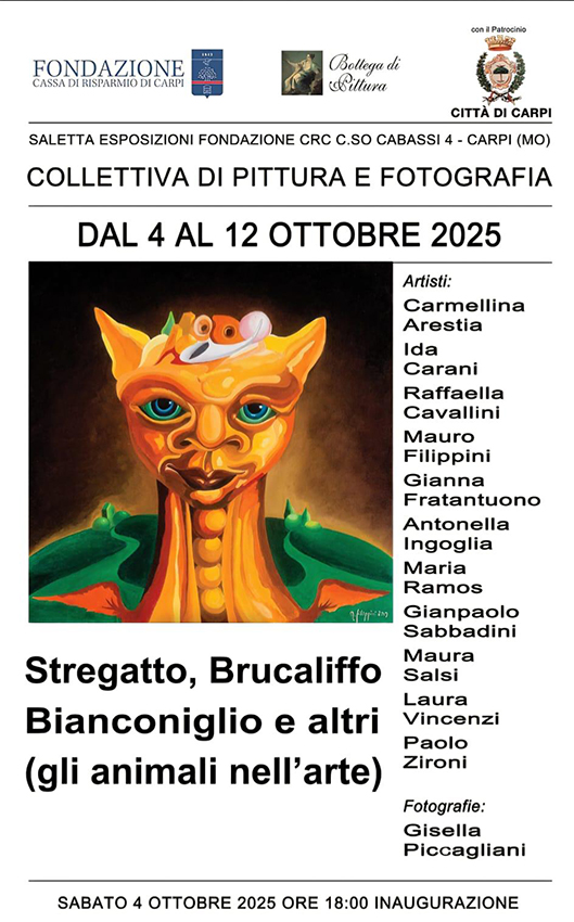 Sembrerà di essere catapultati nel magico Paese di Alice delle Meraviglie varcando la soglia della mostra collettiva di Bottega di Pittura di Carpi, in programma dal 4 al 12 ottobre presso la saletta espositiva della Fondazione Cassa di Risparmio di Carpi al civico 4 di Corso Cabassi, dal titolo evocativo Stregatto, Brucaliffo, Bianconiglio e altri: gli animali nell’arte, che ha appunto per protagonisti gli animali, ritratti sia in versione fantastica che realistica.