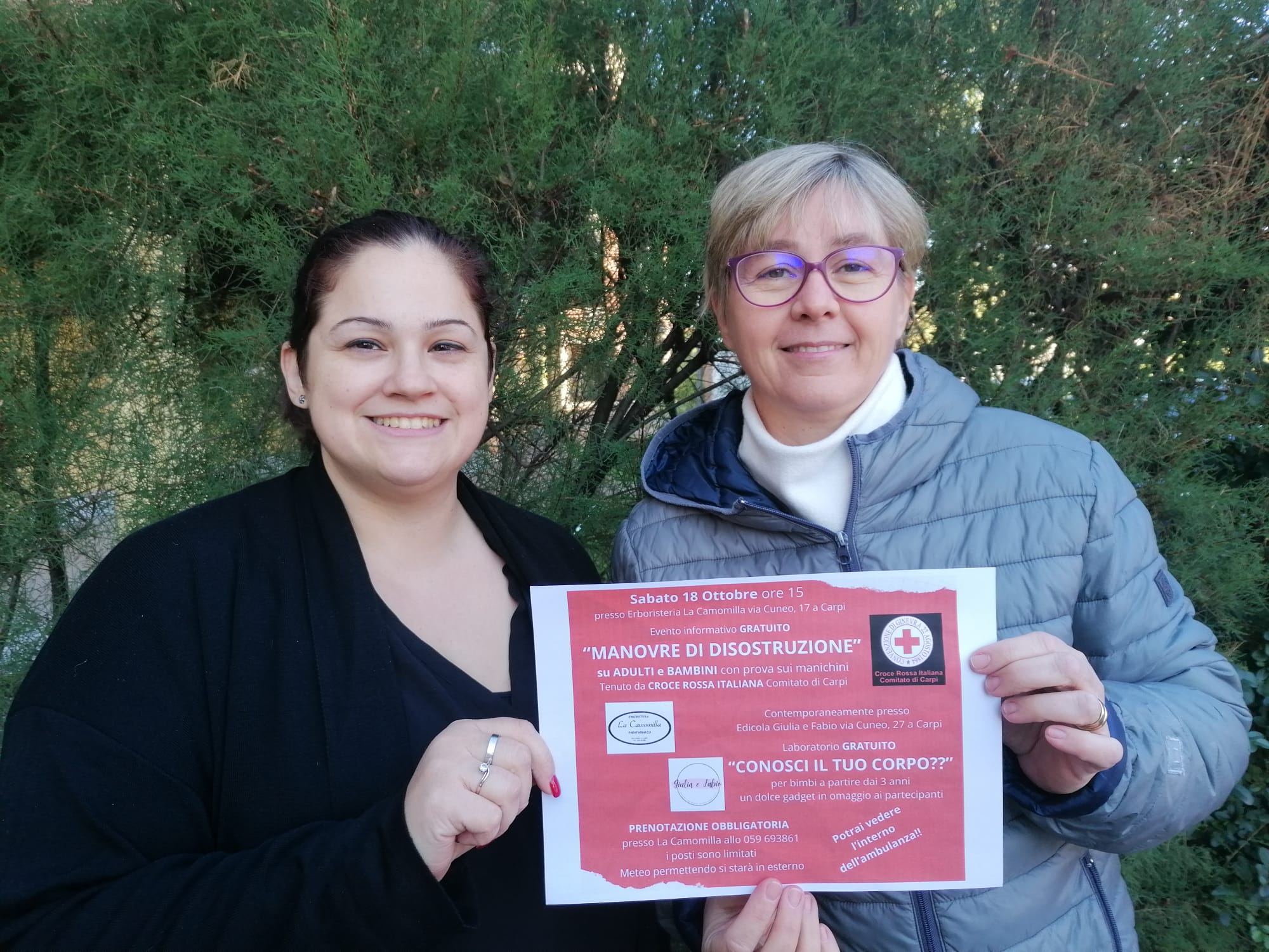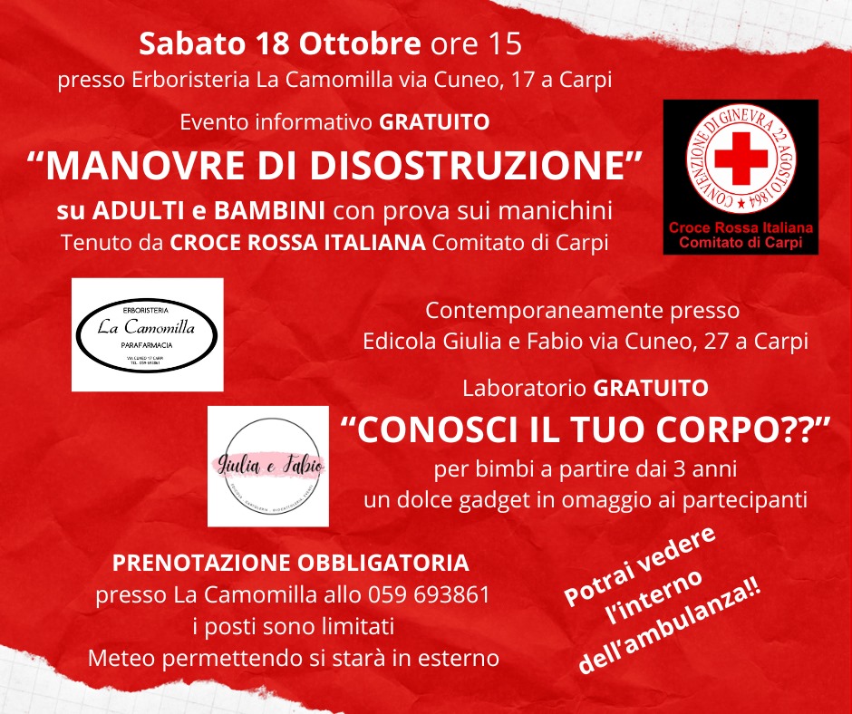 E per educare e sensibilizzare la cittadinanza, Patrizia Bombarda dell’Erboristeria La Camomilla e Giulia Ferretti dell’Edicola Giulia & Fabio di via Cuneo organizzano, grazie alla preziosa collaborazione dei volontari della Croce Rossa di Carpi un momento di formazione aperto a tutti (la partecipazione è gratuita ma su prenotazione al numero 059683861) di disostruzione delle vie aree in età adulta e pediatrica. L’appuntamento è sabato 18 ottobre, alle 15, quando, sotto al portico, in corrispondenza dell’erboristeria, al civico 17 di via Cuneo, i volontari della Cri spiegheranno come intervenire tempestivamente in caso di vie aree ostruite e, grazie all’impiego di appositi manichini, i presenti potranno mettere in pratica la teoria appresa.