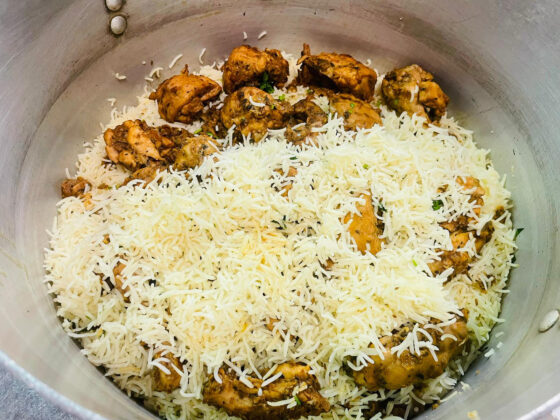 La ricetta di Muteeba Zahid: “la preparazione del Chicken Biryani, ovvero del Biryani classico a base di pollo prevede molti passaggi. Dapprima metto a bollire il riso Basmati insieme ad alcune spezie intere (che poi tolgo) e lo lascio cuocere fino circa al 75%. In una pentola alta faccio soffriggere della cipolla nell’olio insieme a pepe nero, chiodi di garofano, cannella, curcuma e foglie di alloro. In seguito, aggiungo l’aglio, lo zenzero macinato e il pollo a pezzi di media grandezza e con le ossa che danno sapore, sale, coriandolo intero e in polvere, un po’ di curcuma, di peperoncino rosso in polvere e di Garam Masala (mix di spezie), pomodoro fresco, coriandolo fresco e succo di limone e faccio insaporire per alcuni minuti. A quel punto aggiungo lo yogurt che ho amalgamato con una miscela di spezie a base di acqua di rose, mescolo e copro col coperchio, e lascio cuocere per circa 40 minuti finché il pollo diventa tenerissimo. Dopo aver scolato il riso, in un pentolone grande inizio a fare gli strati di Chicken Biryani partendo dal riso, sopra cui metto il pollo, poi di nuovo il riso e così via fino alla fine per poi spolverare con del coriandolo fresco. Copro con un foglio di alluminio o un canovaccio e sigillo col coperchio su cui metto qualcosa di pesante perché non deve uscire umidità e finisco di cuocere per altri 30 minuti. Una volta terminata la cottura mescolo e impiatto”.