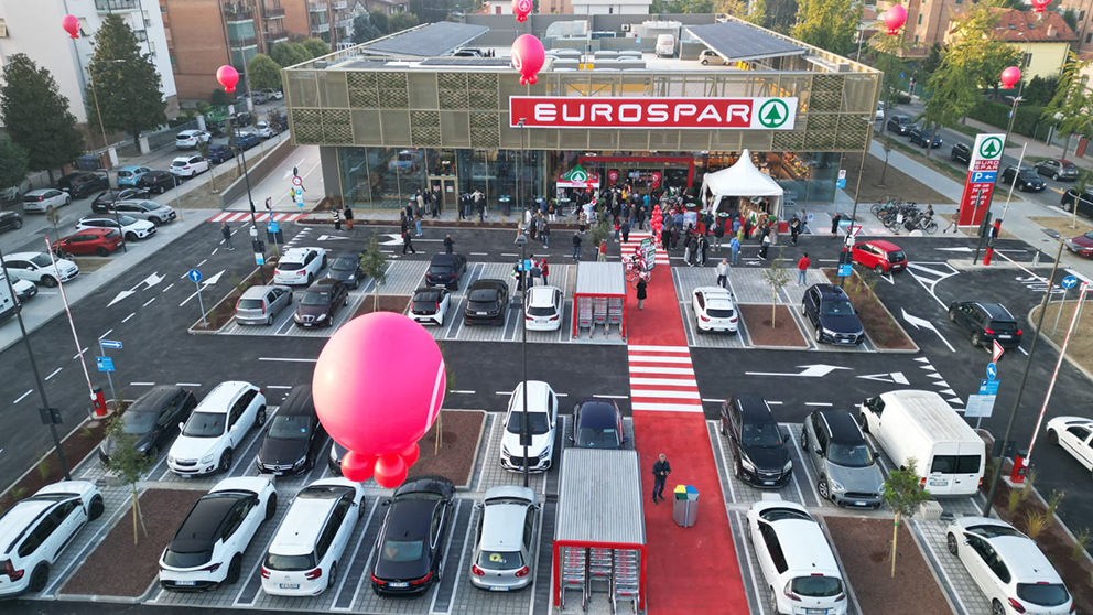 Il nuovo Eurospar di Carpi avrà due parcheggi: oltre a quello in ingresso, anche un’area sul tetto. Il progetto di rigenerazione dell’area ha visto la demolizione dei capannoni industriali esistenti e un dimezzamento della superficie edificata in favore di superfici a verde, per oltre 2mila metri quadri: ne sono previsti infatti un migliaio di verde privato e 1.523 di parco attrezzato inclusivo. Intorno al punto vendita sono stati messi a dimora 79 alberi e 252 arbusti, a cui si aggiungeranno ulteriori piante nell’ambito del progetto di compensazione CarbonZero. Sono invece 233 i pannelli fotovoltaici installati che contribuiranno in modo significativo alla produzione di energia pulita.