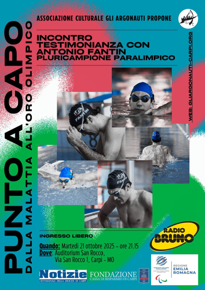 Martedì 21 ottobre, alle 21,15, all’Auditorium San Rocco di Carpi, l’associazione Gli Argonauti propone un incontro-testimonianza con Antonio Fantin, pluricampione paralimpico.
