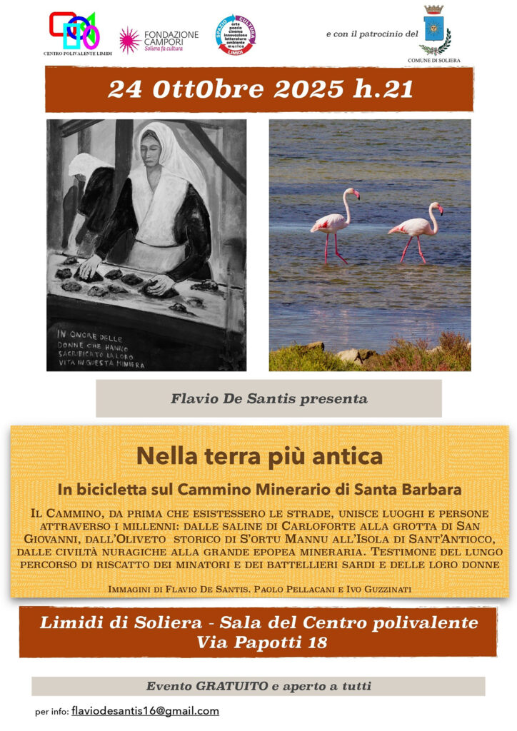 Venerdì 24 ottobre, alle ore 21, al Centro polivalente di Limidi (Via Papotti n. 18), continua il programma culturale con una serata ormai tradizionale: turismo sostenibile, paesaggistico e di approfondimento. Flavio De Santis intratterrà il pubblico, che lo ha già apprezzato in precedenti incontri, con immagini commentate di un interessante viaggio in bicicletta sul Cammino Minerario di Santa Barbara. Antico percorso che unisce luoghi e persone attraverso i millenni: dalle saline di Carloforte alla grotta di San Giovanni, dall’Oliveto storico di S’ortu Mannu all’Isola di Sant’Antioco, dalle civiltà nuragiche alla grande epopea mineraria. Testimone del lungo percorso di riscatto dei minatori e dei battellieri sardi e delle loro donne. Le fotografie sono state scattate da Flavio De Santis, Paolo Pellacani e Ivo Guzzinati.
