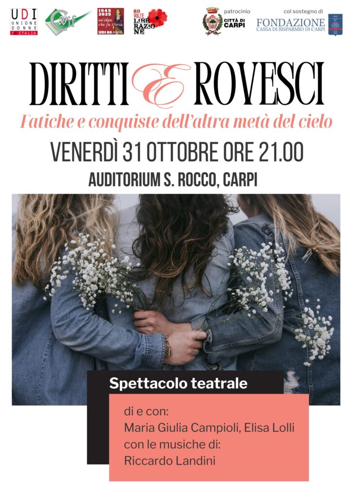 Nell’ambito delle iniziative per gli 80 anni di lotte e iniziative di Udi e Cif di Carpi, venerdì 31 ottobre alle 21 presso Auditorium San Rocco, a ingresso libero, si terrà lo spettacolo Teatrale “Diritti e Rovesci – Fatiche e conquiste dell’altra metà del cielo”, di e con Maria Giulia Campioli e Elisa Lolli, con le musiche di Riccardo Landini.