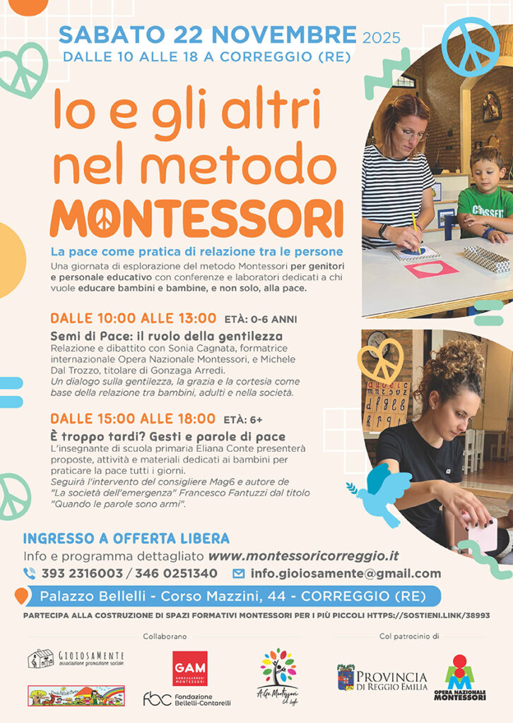 Io e gli altri nel Metodo Montessori – La pace come pratica di relazione tra le persone è il tema del prossimo evento divulgativo sul Metodo Montessori a Correggio. L’appuntamento è sabato 22 novembre, dalle 10 alle 18, presso Palazzo Bellelli, in Corso Mazzini 44 a Correggio insieme a Sonia Cagnata, Michele Dal Trozzo, Eliana Conte e Francesco Fantuzzi. Gioiosamente, associazione di promozione sociale attiva nei progetti educativi Montessori dal 2018, ha organizzato anche quest’anno una giornata di esplorazione del metodo Montessori per genitori e personale educativo. Chi vuole educare bambini e bambine, e non solo, alla pace? Sabato 22 novembre al mattino ci si dedicherà ai più piccoli e a cosa, dagli 0 ai 6 anni, può arricchire la relazione tra bambini, tra bambino e adulto e.. anche tra adulti! Sonia Cagnata, formatrice internazionale Opera Nazionale Montessori e Michele Dal Trozzo, titolare di Gonzaga Arredi, azienda autorizzata per la produzione di materiale Montessori esploreranno il ruolo della gentilezza, della grazia e della cortesia illustrata già dagli Anni ’30 nel metodo. Quanti bambini e bambine salutano con cortesia, si siedono, danno precedenza… o il proprio posto in autobus? Quali sono i piccoli gesti che possono cambiare la società e come trasmetterli ai più piccoli? Nel pomeriggio di sabato 22 novembre ci dedicheremo ai più grandi, perché… non è troppo tardi! L’insegnante di scuola primaria Montessori Eliana Conte porterà esempi sul praticare la pace e le proposte, le attività e i materiali che ha condiviso con i “suoi” bambini dai 6 agli 11 anni, frequentanti la scuola a differenziazione didattica Colonnello Lugli di Santa Croce di Carpi.