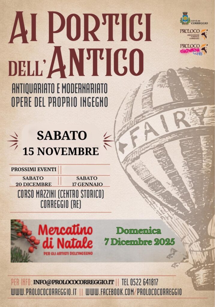 Sabato 15 novembre torna a Correggio Ai Portici dell’antico, il mercatino dell’antiquariato e del modernariato sotto i portici di Corso Mazzini. Alla ricerca di qualche occasione si possono ammirare i portici Correggesi e non solo. Sono aperte le iscrizioni al Mercatale, mercatino dedicato ai bambini, per vendere, scambiare e riutilizzare giochi, vestiario e accessori da bambino. Sarà l’8 dicembre dalle 9 alle 13 Le iscrizioni devono essere inviate a info@prolococorreggio.it, indicando nome e cognome e cellulare del genitore , il numero di tavoli ed eventuali preferenze per essere vicino ad amici. L’evento è completamente gratuito.