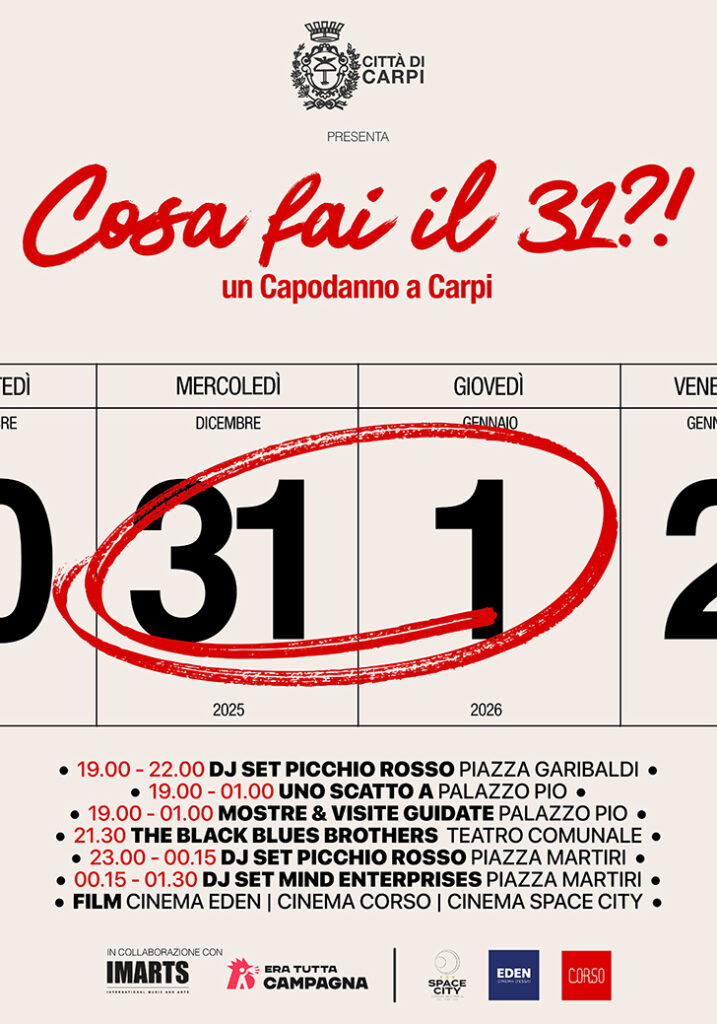 Il 31 dicembre Carpi accoglie il nuovo anno con una festa diffusa in piazza Martiri e nelle vie del centro storico, tra dj set, attività e sorprese nei Musei di Palazzo dei Pio, il tradizionale spettacolo al Teatro Comunale e le proiezioni nei cinema. Una serata pensata per tutte le età, per vivere insieme la città e valorizzare i suoi luoghi più rappresentativi.
