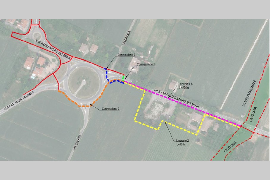 Il tratto carpigiano di pista ciclabile è compreso fra la rotatoria via Aldo Moro esterna – Via Cavata – via Cavalcavia Lama (in seguito indicata come rotatoria Aldo Moro) e il ponte sul Cavo Lama che segna il confine con il Comune di Soliera.