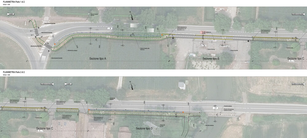 I ciclisti dal lato nord della rotatoria (tracciato rosso), attraverseranno sullo spartitraffico (tracciato blu) per imboccare la provinciale Carpi – Ravarino e proseguire sul lato sud (tracciato viola) protetti dagli alberi, dove ci sono, e dalle barriere di sicurezza imposte dalla Provincia di Modena.