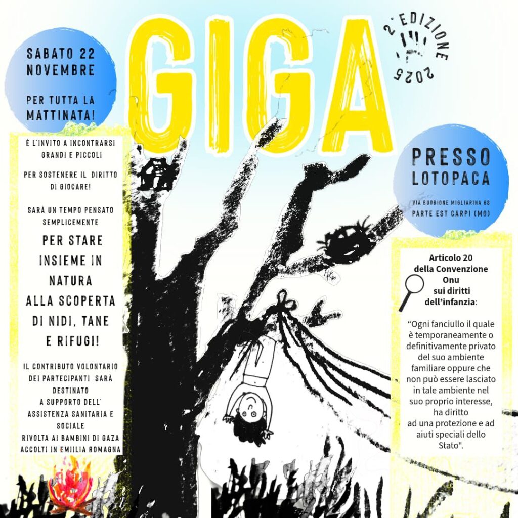 Sabato 22 novembre, per tutta la mattinata, l’appuntamento è a Lotopaca in via Budrione Migliarina, 88 con Giga – Gioca, Immagina, Guarda e Ascolta. Un momento di festa rivolto alle famiglie per ribadire l’importanza del gioco soprattutto per i più piccoli. Un tempo pensato per stare insieme nella natura, alla scoperta di nidi, tane e rifugi. Numerosi i professionisti che aspetteranno grandi e piccini per guidarli tra narrazioni, danze, giochi sonori, la liberazione di qualche animale selvatico curato dal Centro Fauna Il Pettirosso e una grande caccia al tesoro per veri esploratori: Laura Malavasi, Margherita Dotti, Silvia Gozzi, Martina Loschi, Simone Zanti, Andrea Cerè, Daniela Bertacchini, Elisabetta Romagnoli e Monica Dipietro.
