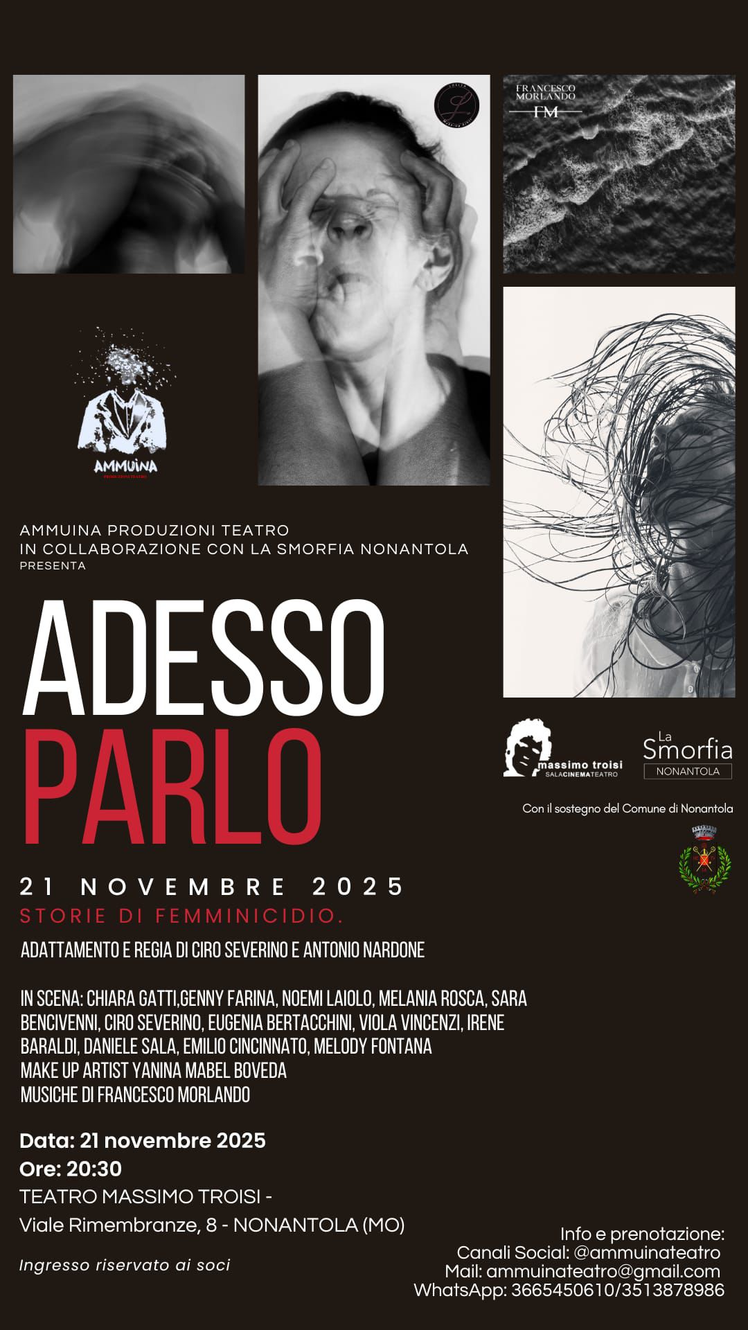 Ammuina Produzioni Teatro di Carpi, in collaborazione con La Smorfia Nonantola e con il sostegno del Comune di Nonantola, presenta “Adesso Parlo”, un intenso spettacolo teatrale che dà voce alle vittime di femminicidio, trasformando il silenzio in memoria e testimonianza, in programma venerdì 21 novembre, alle 20.30, al Teatro “Troisi” di Nonantola.