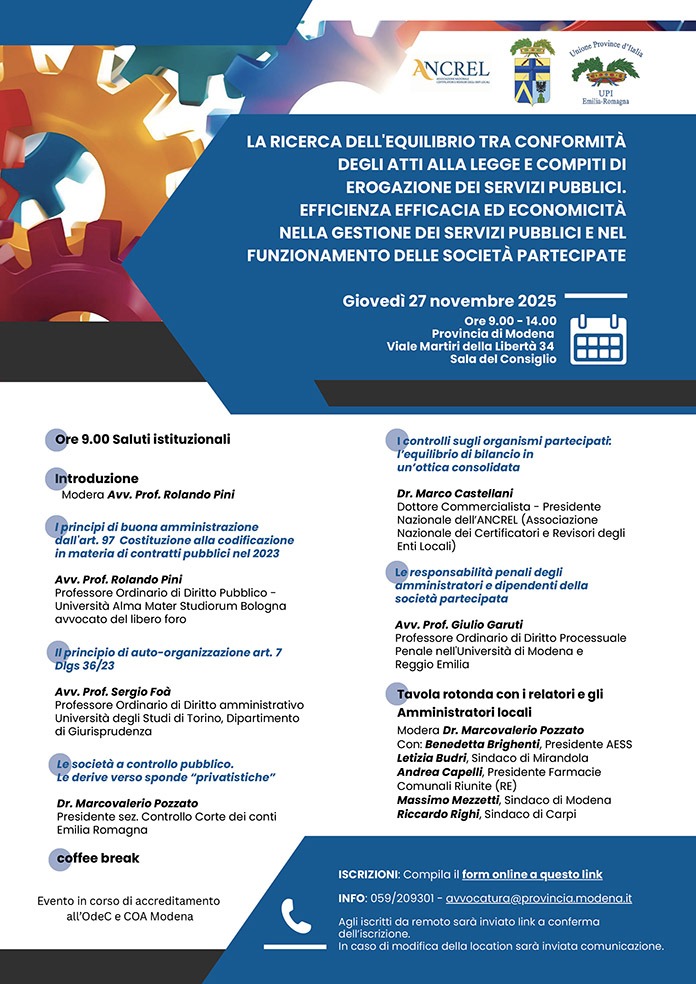 Giovedì 27 novembre 2025 dalle ore 9.00 alle 14.00, nella Sala del Consiglio della Provincia di Modena, si terrà il convegno dal titolo: “La ricerca dell’equilibrio tra conformità degli atti alla legge e compiti di erogazione dei servizi pubblici. Efficienza, efficacia ed economicità nella gestione dei servizi pubblici e nel funzionamento delle società partecipate“. L’evento sarà un’occasione di confronto sul ruolo delle pubbliche amministrazioni nell’erogazione dei servizi, con uno sguardo alle regole, alla qualità gestionale e all’impatto sul territorio.