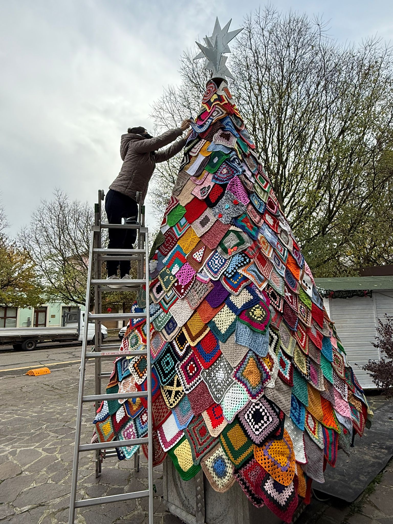 “La struttura e la punta in legno sono state realizzate da volontari e le mattonelle sono state cucite da noi tre, una ad una, ad una rete in plastica che lo avvolge. Quattro triangoli che poi sono stati fissati e collegati tra loro una volta completata l’opera di cucito. Per fare una cosa inedita non abbiamo unito le mattonelle a formare una coperta, bensì le abbiamo sovrapposte a squama di pesce in modo da creare una moltitudine di colori che caratterizza la composizione. Le mattonelle sono tutte diverse l’una dall’altra, e sono state realizzate con gomitoli di recupero raccolti nella case di tantissime persone che generosamente ce li hanno donati”.
