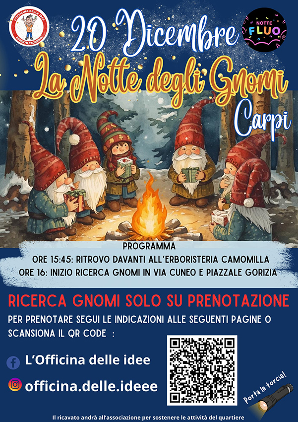 Per i più piccoli i commercianti hanno ideato, alle 16, La notte degli gnomi, una caccia al tesoro da compiere armati di torcia (per prenotarsi occorre inquadrare il QR code del volantino che alleghiamo), il ritrovo è alle 15.30 davanti all’Erboristeria La Camomilla in via Cuneo, 17. Alle ore 16.30 prenderanno poi il via vari laboratori gratuiti a tema natalizio in via Cuneo e Piazza Gorizia sempre dedicati ai bambini e poi, alle 17, ad arrivare nel quartiere a bordo della sua slitta sarà Babbo Natale in persona, trainato dai trattori addobbati del Vintage Tractors, che distribuirà sacchettini di caramelle.