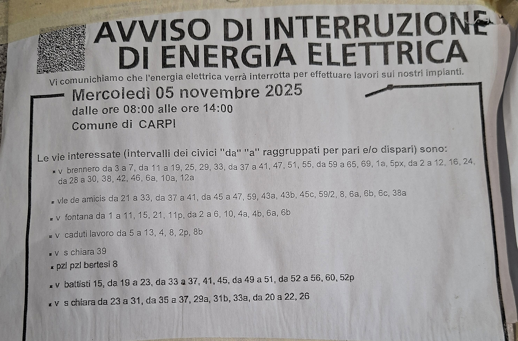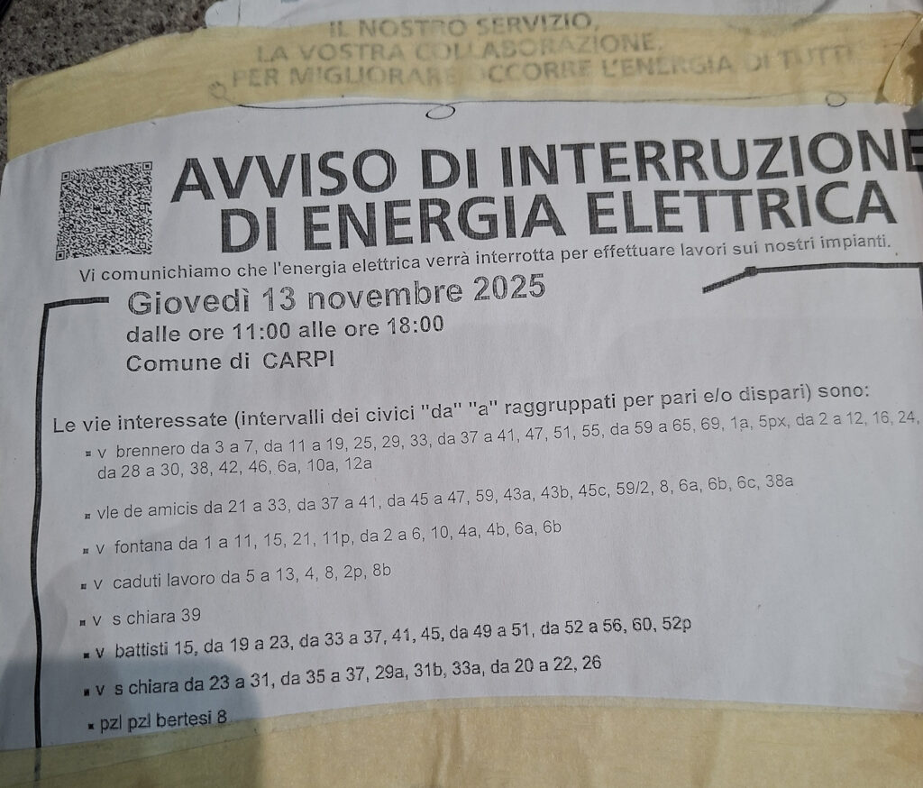 A partire dal mese di ottobre, nelle vie Brennero, De Amicis, Fontana, Caduti del Lavoro, Santa Chiara, Battisti e Piazzale Bertesi sono stati già apposti quattro avvisi di interruzione di energia elettrica relativi alle giornate del 24 ottobre, del 5 e 13 novembre e del 16 dicembre. Disagi annunciati che hanno spinto alcune attività commerciali a tenere la serranda abbassata nei giorni indicati, poiché impossibilitati a lavorare senza corrente, peccato però che sia il 24 ottobre che il 5 novembre, negli orari scritti nero su bianco negli avvisi, l’energia elettrica sia sempre stata garantita, “e così, oltre al danno economico legato al mancato incasso si é aggiunta pure la beffa” spiega un’esercente di viale De Amicis.