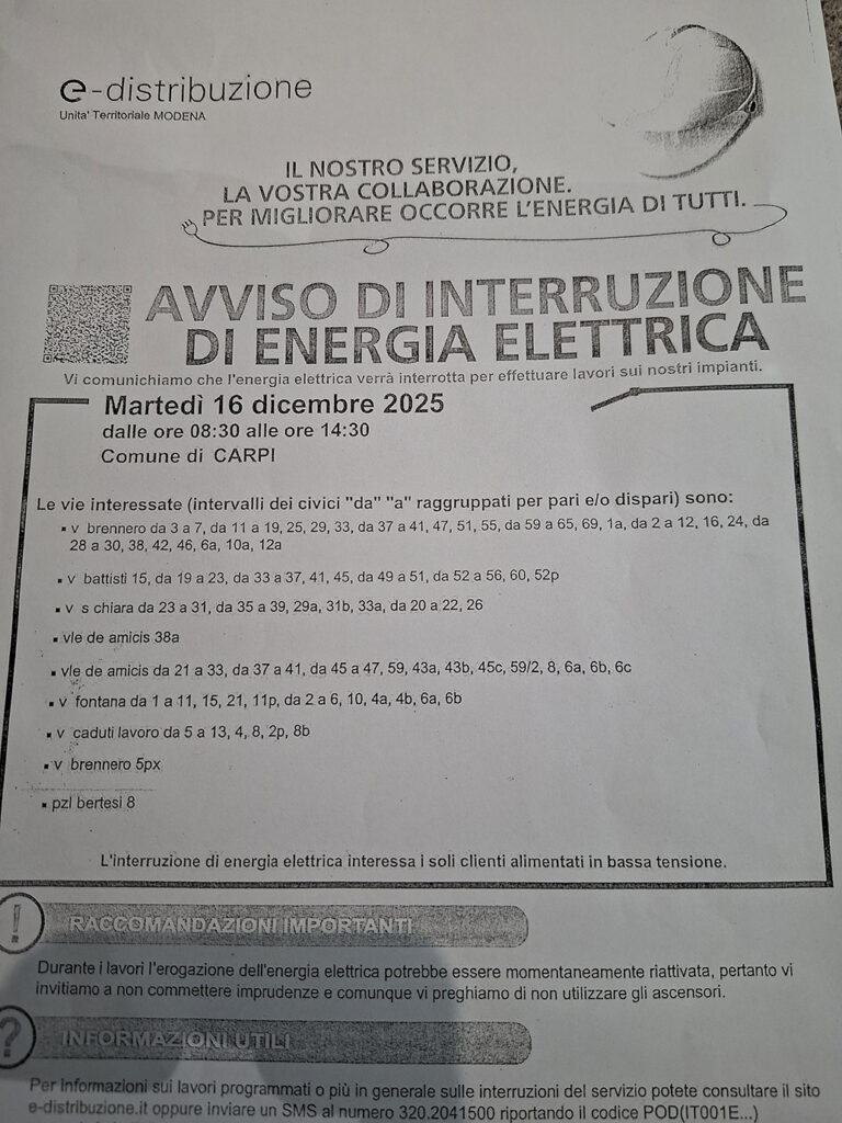 L’interruzione del 16 dicembre, concludono da Enel, “necessaria per il completamento del lavoro al cliente” è confermata ma, mettono le mani avanti, “il lavoro è in altezza e pertanto potrà essere eseguito solo se le condizioni meteo non saranno proibitive”.