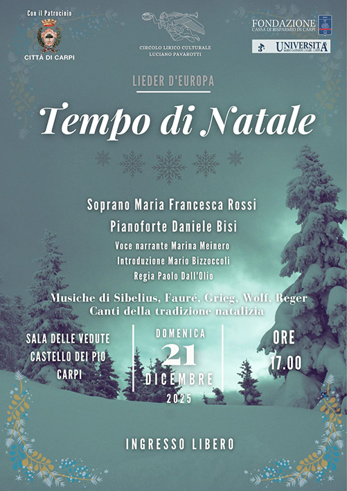 Tempo di Natale – Lieder d’Europa farà risuonare a Carpi le colte composizioni della tradizione natalizia e di grandi compositori come Sibelius, Fauré, Grieg, Wolf e Reger. Il pomeriggio liederistico vede la partecipazione del soprano Maria Francesca Rossi accompagnata al pianoforte dal Maestro Daniele Bisi. A condurre gli spettatori attraverso questo viaggio musicale, firmato dal regista Paolo Dall’Olio, saranno Mario Bizzoccoli e la voce narrante Marina Meinero. Tempo di Natale è patrocinato dal Comune di Carpi ed è realizzato grazie al sostegno della Fondazione Cr Carpi e dell’Università Gasparini Casari. L’ingresso è libero, fino a esaurimento posti.