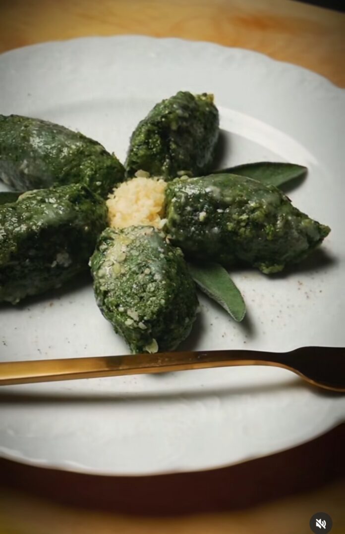 In una ciotola mescolare la ricotta con il sale, il parmigiano, un uovo e noce moscata. Aggiungere gli spinaci precedentemente cotti con olio, sale e uno spicchio d’aglio e strizzati per eliminare l’acqua, e amalgamare il tutto. Con l’impasto formare degli gnocchetti allungati, spolverarli con la farina e cuocerli in acqua bollente pochi secondi, poi passarli in padella con burro e salvia.