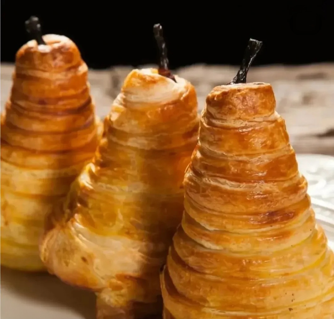 Pelare le pere, svuotare la parte centrale e aggiungere il formaggio tagliato a dadini. Tagliare la pasta sfoglia in quadretti e striscioline, ricoprire le pere, spennellare con l’uovo sbattuto e infornare a 180° per 15 minuti. Servire con del miele.