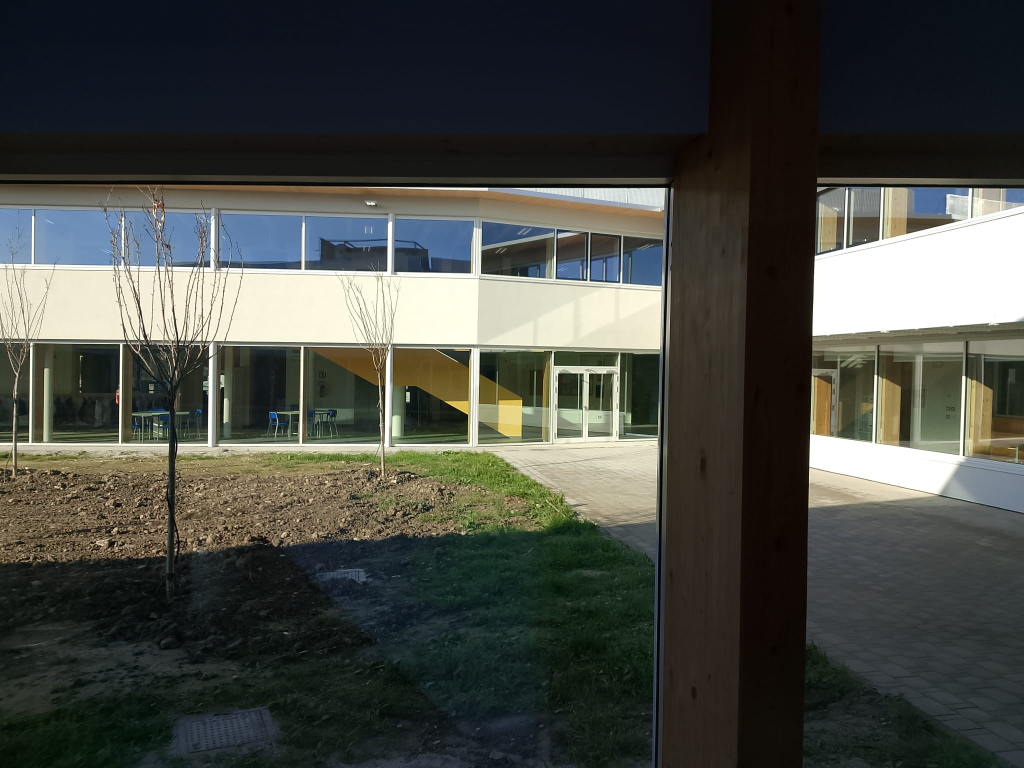 L’edificio si sviluppa su una superficie coperta di circa 4.100 metri quadrati e si distingue per una configurazione a due volumi contrapposti, entrambi di due piani, che definiscono una grande corte-giardino interna. Questo spazio centrale è il cuore pulsante del polo, su cui convergono i laboratori, la mensa e gli spazi di relazione, progettati per essere ampi e visivamente connessi con l’esterno per promuovere l’idea di una scuola aperta al territorio. La corte è delimitata a sud dal corpo della mensa, caratterizzato da un terrazzo praticabile in copertura, e a nord da un edificio dedicato alle aule di scienze e arte, mentre l’intero complesso si integra armoniosamente con il contesto urbano di via IV Novembre attraverso una nuova area pubblica pedonale e verde che ha permesso di salvaguardare le alberature esistenti.