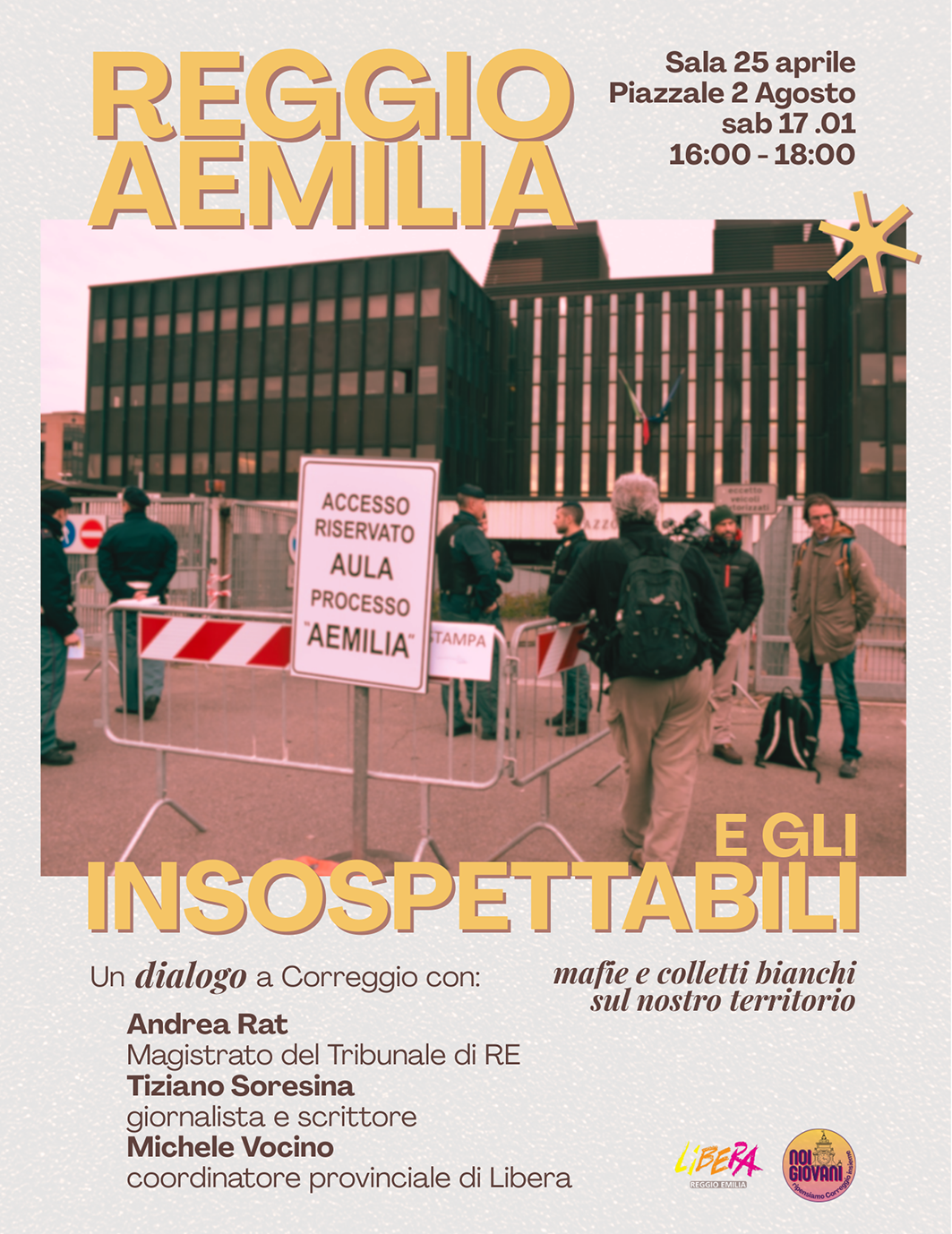 La mafia, anzi, le mafie sono diverse, multiformi, al passo con i tempi, spesso difficili da riconoscere e, soprattutto, presenti su tutto il territorio italiano. È con questa consapevolezza che Noi Giovani ha deciso di organizzare un momento di confronto aperto al pubblico dal titolo Reggio Aemilia e gli insospettabili – mafie e colletti bianchi sul nostro territorio: sabato 17 gennaio, alle ore 16, presso la sala del Centro Sociale 25 Aprile a Correggio. Al tavolo dei relatori personalità che conoscono molto bene la realtà reggiana: Andrea Rat, Giudice che ha vissuto da protagonista il processo Aemilia; Tiziano Soresina, giornalista e memoria storica delle cronache giudiziarie locali; Michele Vocino e Sofia Lo Mascolo, coordinatori di Libera della provincia di Reggio Emilia, punto di riferimento per la cultura della legalità.