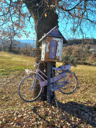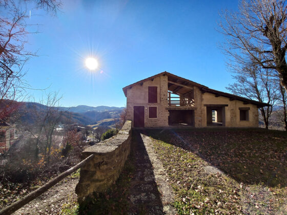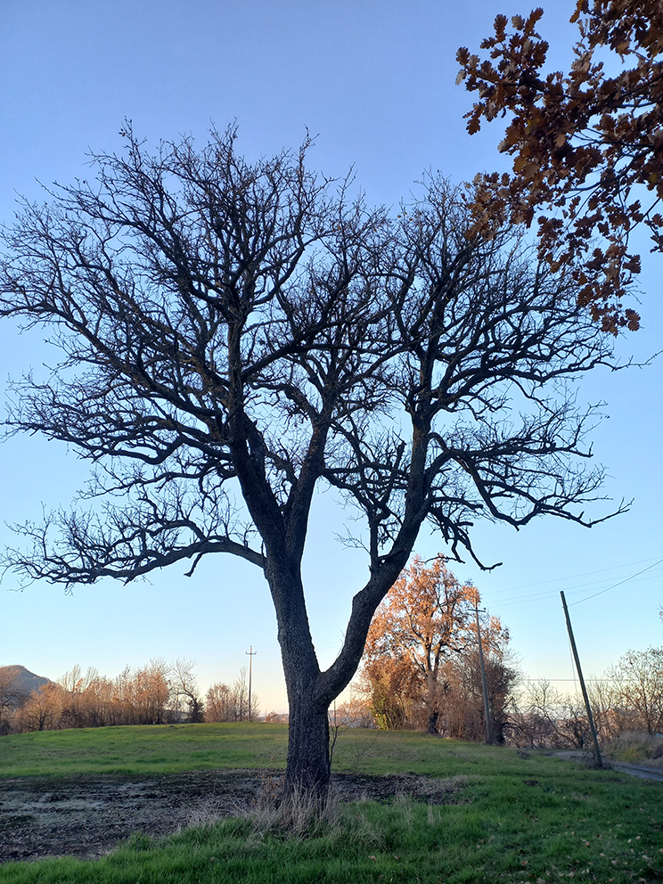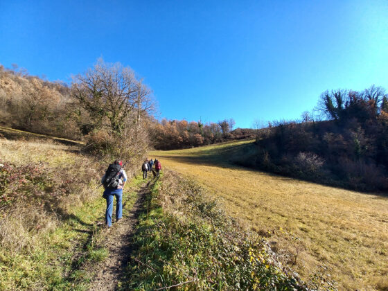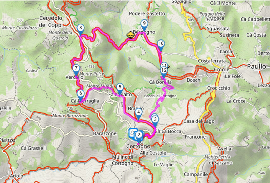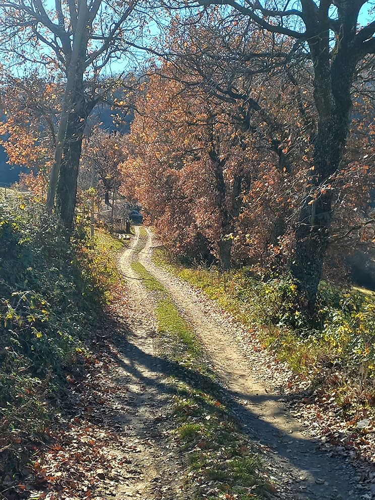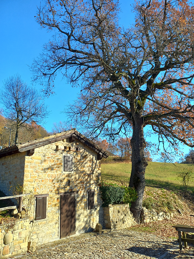 La proloco locale, animata da una trentina di abitanti giustamente innamorati del loro incantevole borgo, tiene aperto su richiesta un bar. C’è anche il ristorante che aprono in alcune occasioni particolari oppure con una richiesta di una trentina di persone almeno. Fateci un pensiero per festeggiare una vostra ricorrenza: non abbiamo potuto provare la loro cucina ma l’elenco che ci hanno fatto di piatti preparati da loro con ingredienti locali è molto attraente. Per le iniziative del Borgo e le aperture del ristorante ci aiuta la loro pagina Facebook “Bergogno Medioevale”. È tempo di tornare verso Cortogno facendo prima un pezzo diritto di strada asfaltata (rif. 10) e poi deviando a destra in corrispondenza di un enorme pero di antica varietà (rif. 11). Non sembra nemmeno un pero da tanto è grande, quindi occhio alle segnaletiche. La strada in salita ci porta ad un primo incrocio dove teniamo la destra, poi invece che proseguire lungo il Sentiero Via Matildica del Volto Santo (rif. 12), scendiamo dalla carrareccia che, a tornanti in mezzo a un prato, ci porta verso il Bosco di Cortogno. Salendo un po’ superiamo una grande azienda agricola fino ad arrivare alla strada che abbiamo fatto all’inizio del percorso.