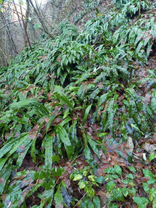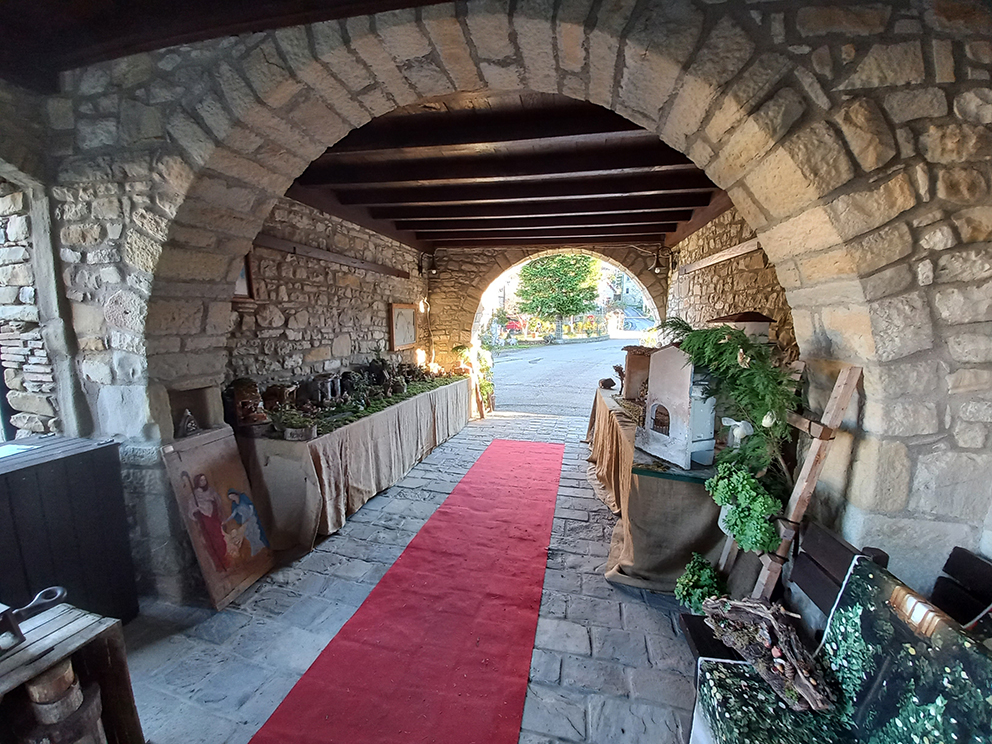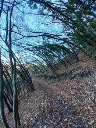 Qui conviene fare una piccola sosta per ammirare il borgo sapientemente restaurato con un metato per l’essiccazione delle castagne fiancheggiato da una meravigliosa rovere. Dall’inizio del borgo sulla destra prendiamo il sentiero, parallelo alla strada, in direzione Cerredolo dè Coppi. Quando incrociamo la strada asfaltata dobbiamo fare una decina di metri avanti per trovare su lato opposto la carrareccia che ci porta a Bergogno passando dal Bosco della Pentoma. I cartelli presenti non solo ci ammoniscono di mettere l’accento sulla e (del resto tutti i borghi qui hanno delle pronunce non semplicissime o comunque un po’ diverse da quello che ci aspetteremmo) ma ci dice anche che troveremo delle piccole meraviglie: una cascata di acqua molto calcarea che sta dando origine a formazioni rocciose particolari, una sorgente di acqua solforosa, una colonia di felci molto particolari e una zona dove gli alberi sono piegati in modo decisamente anomalo, come se avessero subito la violenza di uno tsunami. Vi lasciamo gustare tutte queste curiosità nel tratto in discesa … sapendo che poi per la legge che in montagna vale come in fisica per la conservazione della massa, ci sarà una salita. Lo sforzo è ampiamente ripagato dalla visita del bordo di Bergogno, zona super Matildica, con vista verso Rossenella e Canossa in direzione sud.