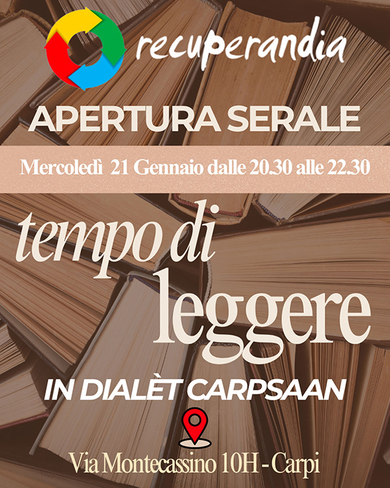 Mercoledì 21 gennaio la bottega del riuso Recuperandia, centro operativo di Porta Aperta Carpi, aprirà in orario serale per un’iniziativa dedicata alla lettura e alla valorizzazione del dialetto carpigiano.
