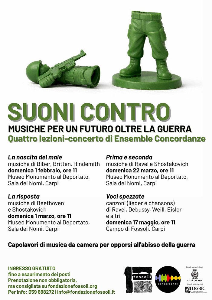 Suoni contro. Musiche per un futuro oltre la guerra è questo il titolo della nuova rassegna promossa a Carpi da Fondazione Fossoli e che consisterà in quattro lezioni-concerto di Ensemble Concordanze presso il Museo Monumento al Deportato e il Campo di Fossoli nelle domeniche del 1° febbraio, 1° marzo, 22 marzo e 17 maggio, sempre alle ore 11. Quattro appuntamenti unici e gratuiti che esplorano il rapporto tra musica e guerra dall’antichità fino alle grandi guerre del Novecento. Può il linguaggio artistico, che più di ogni altro parla all’emotività, non limitarsi a esprimere il dolore, bensì cambiare le convinzioni politiche e filosofiche? Può la musica indicarci la strada per superare la guerra?