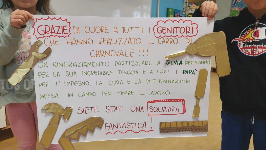 “Questa iniziativa – raccontano le maestre – va oltre il semplice divertimento: è un inno alla collaborazione tra famiglie e scuola, ma anche un modello replicabile per il futuro, e che evidenzia l’alleanza indispensabile tra genitori e insegnanti, vitale in un periodo come questo, segnato da sfide che chiedono agli adulti di unirsi e di camminare fianco a fianco per crescere i bambini trasmettendo valori di convivenza, solidarietà e fantasia. Progetti come questo carro dimostrano come il coinvolgimento genitoriale rafforza la resilienza dei bambini, insegna il lavoro di squadra e trasmette che la comunità è una “nave spaziale” da pilotare insieme per raggiungere qualsiasi stella!”