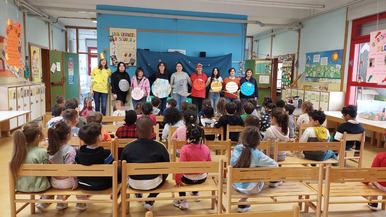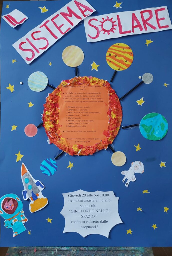 Mentre le maestre guidavano la narrazione con maestria, i pianeti si sono presentati uno ad uno: la Terra rigogliosa con i suoi verdi prati, Mercurio il messaggero veloce, Nettuno avvolto nei suoi misteriosi anelli blu. I bambini si sono presi per mano e hanno dato vita a un grande girotondo “…attorno al Sole, il re del mondo! Grandi, piccoli, rossi o blu, i pianeti siamo noi… e ci sei anche tu!”. Nel finale maestre e bambini si sono rivolti al loro pubblico e hanno ripetuto all’unisono “grazie mamme e papà, siete le nostre stelle più luminose!”, scatenando applausi e abbracci. Un ringraziamento speciale è stato dedicato ad Alfonso per aver contribuito con la sua esperienza collaborando con genitori e scuola!