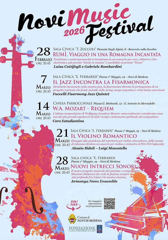 E’ ormai tutto pronto per la quarta edizione del Novi Music Festival, la rassegna musicale voluta dal Comune di Novi di Modena, con la collaborazione della Fondazione Cassa di Risparmio di Carpi, per portare a Novi e nelle frazioni concerti che si caratterizzano per la varietà dei generi e la qualità degli artisti. Nell’edizione 2026 i concerti saranno cinque, uno in più rispetto alla consueta formula dei quattro appuntamenti per quattro sabati di marzo: quest’anno si parte in anticipo, sabato 28 febbraio con il primo concerto a Rovereto sulla Secchia, per concludere il Festival sabato 28 marzo a Novi.