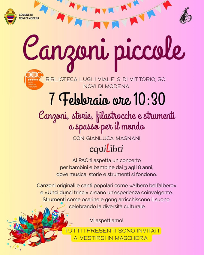 Si chiama Canzoni piccole, il Carnevale che si terrà sabato 7 febbraio, a partire dalle ore 10:30, presso la Biblioteca Vittorio Lugli presso il Pac – Polo Artistico Culturale di Novi di Modena. Largo dunque a canzoni, storie, filastrocche e strumenti a spasso per il mondo insieme al musicista carpigiano Gianluca Magnani.