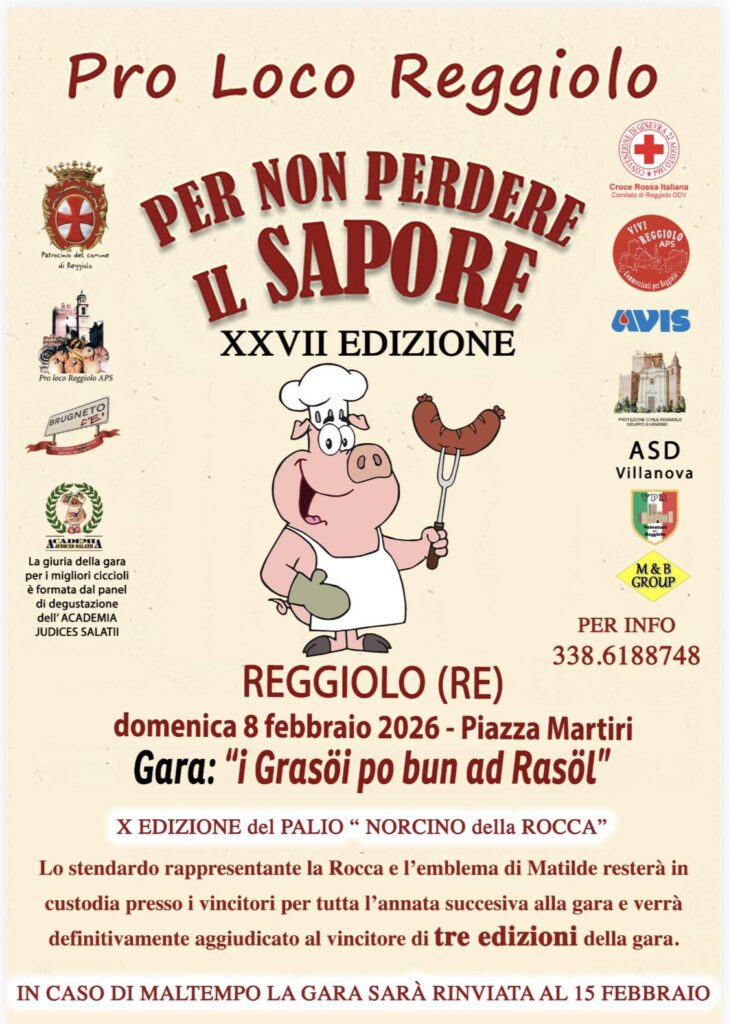 Domenica 8 febbraio Reggiolo celebra la 27ª edizione di Per non perdere il sapore, una festa popolare dedicata alla tradizione norcina e ai sapori autentici del territorio in Piazza Martiri. A rendere il tutto ancora più avvincente, la 10ª edizione del Palio Norcino della Rocca, con lo stendardo raffigurante la Rocca e l’emblema di Matilde che verrà custodito dai vincitori per un anno intero, e assegnato definitivamente a chi lo conquista per tre edizioni. La festa sarà accompagnata da un ricco programma di intrattenimento, con bancarelle, musica, animazione e la partecipazione della giuria ufficiale dell’Academia Judices Salatii.